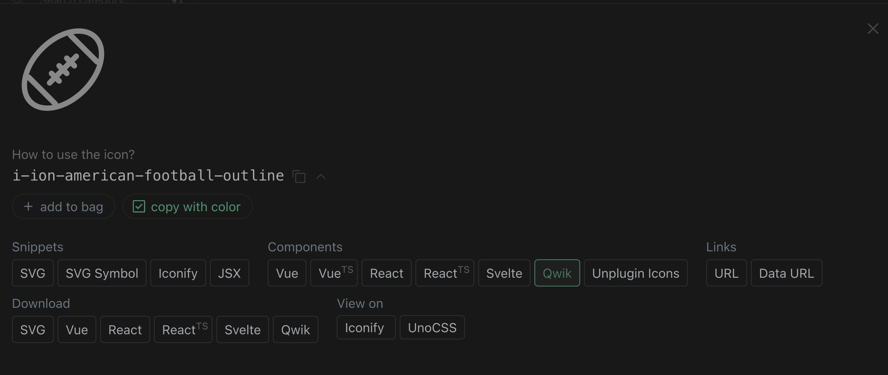 Click the Qwik button to copy the icon code to your clipboard, then paste it into your project.